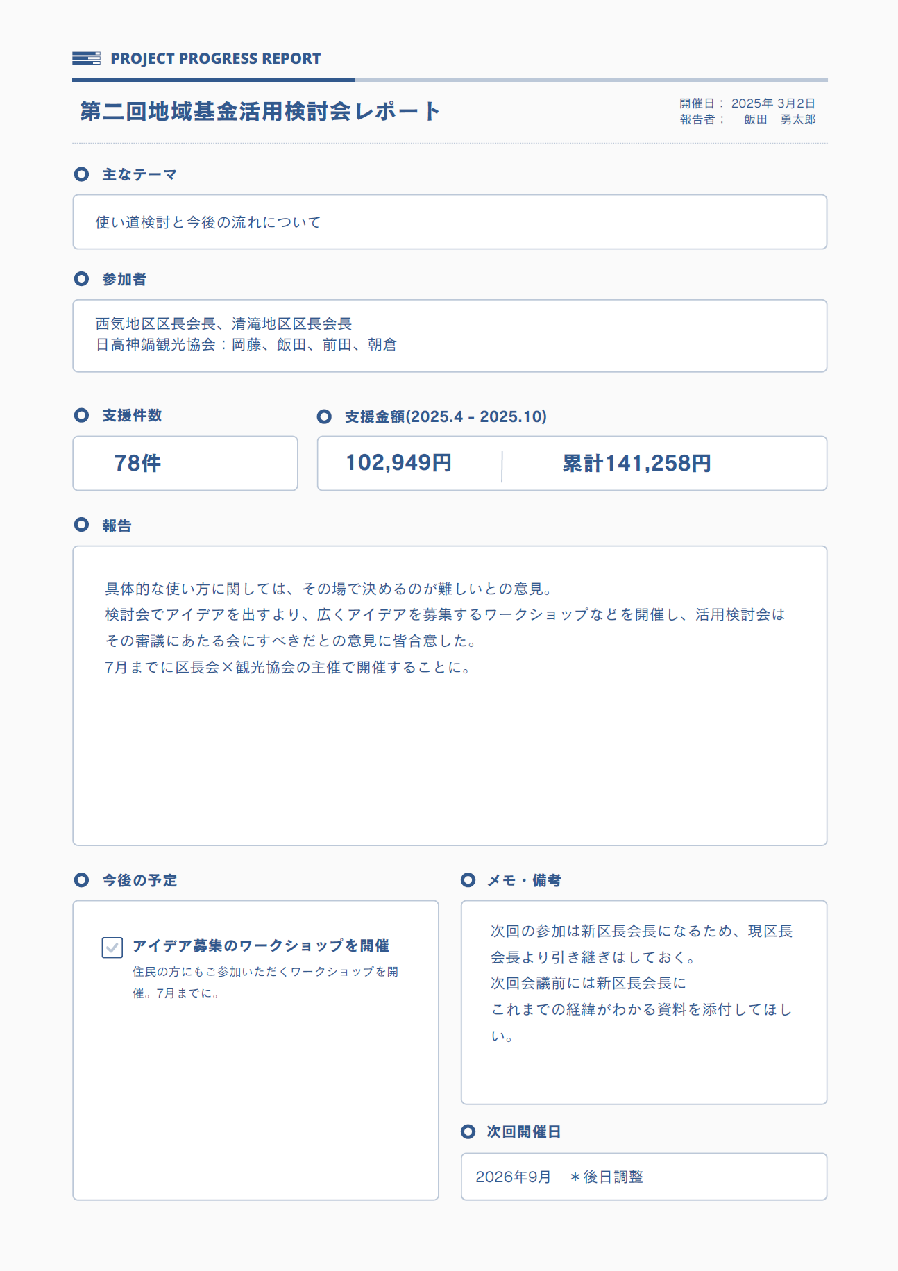 その結果、西気地区区長会・清滝地区区長会・日高神鍋観光協会の主催で地域住民の皆様を募ったワークショップを行うという方向で一致しました。ただ資金を使うだけでなく、いかに地域に還元し、循環させていくか。その仕組みづくりについて、より具体的な検討を進めていく予定です。